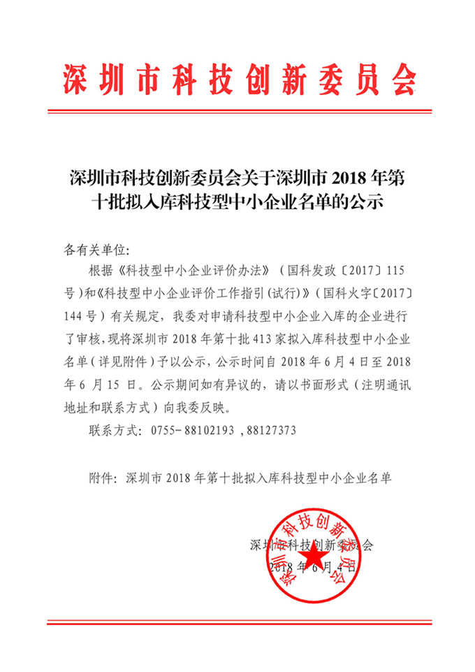 經(jīng)廣東省政府主管部門(mén),深圳市科技創(chuàng)新委員會(huì),深圳市福田區(qū)科創(chuàng)局的一致肯定,成功入庫(kù)“科技創(chuàng)新型企業(yè)”名單。